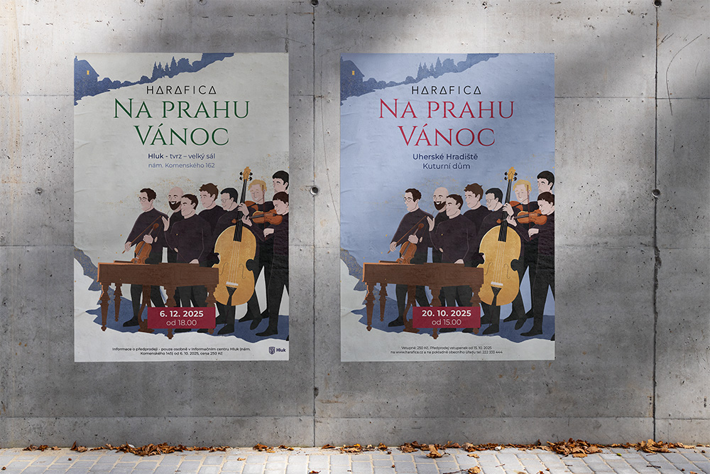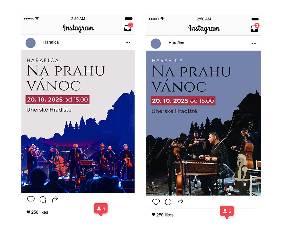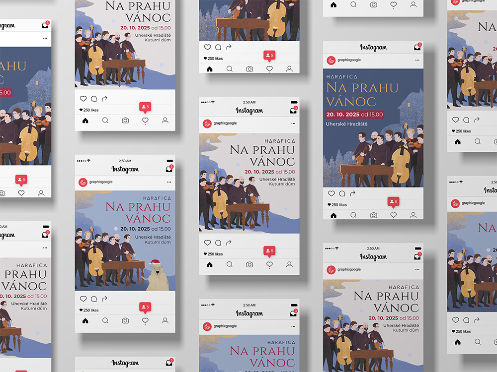 Sada vizuálů pro sociální sítě a online propagaci kulturní akce – návrh layoutu, typografie, adaptace pro různé formáty a platformy.