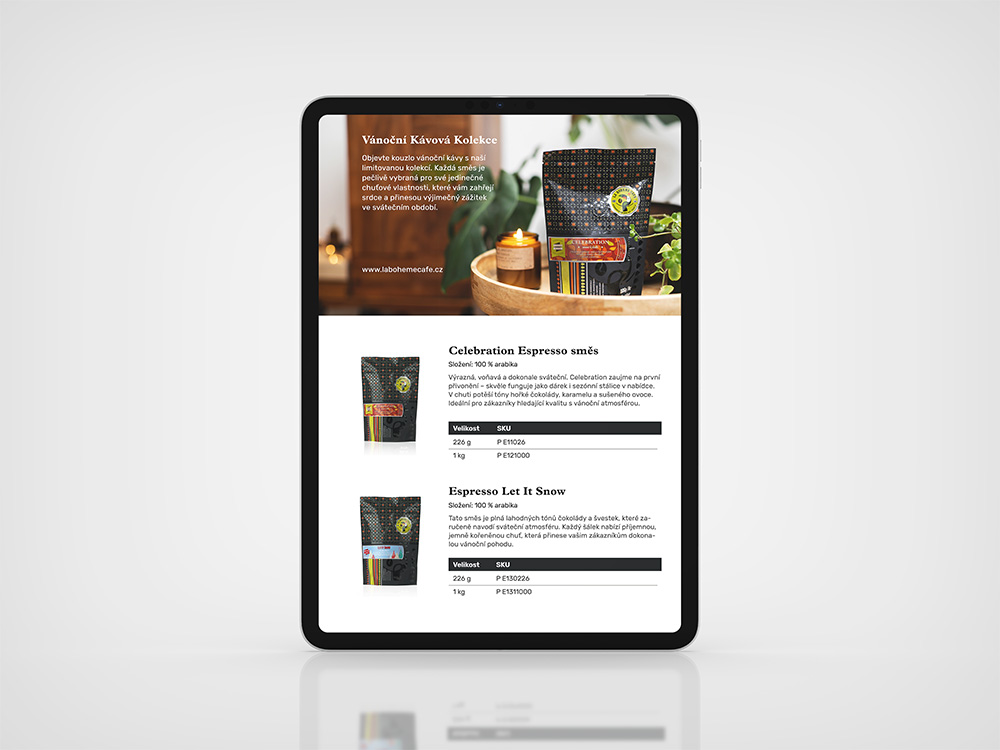 Pro prémiovou pražírnu La Bohème Café jsem připravila vánoční online katalog kávy a čajů určený pro jejich obchodní partnery. Cílem bylo představit sezónní nabídku v jednotném vizuálním stylu, který spojuje eleganci značky a sváteční atmosféru.